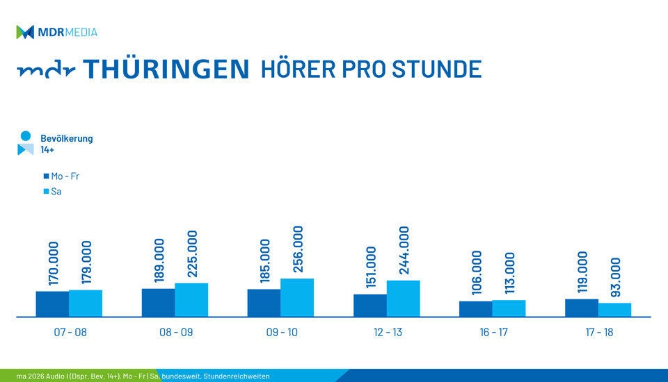 MDR THÜRINGEN vermittelt in seinen multimedialen Ausspielwegen das Lebensgefühl der Thüringer, bietet interaktive Diskussions-Plattformen. Viele Verbraucherthemen, Serviceinformationen, Konzert-Veranstaltungen und unterhaltsame Radio-Aktionen machen MDR THÜRINGEN zu einem perfekten Tagesbegleit-Medium.