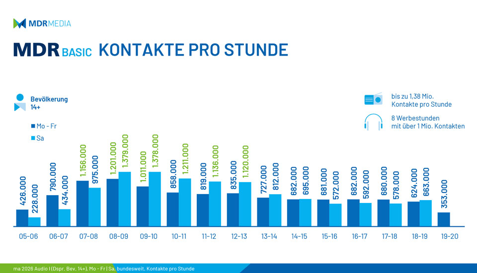 Bestehend aus MDR JUMP sowie den drei MDR Landesprogrammen MDR SACHSEN, MDR SACHSEN-ANHALT und MDR THÜRINGEN erreicht die Millionenkombi die kaufrelevante Zielgruppe in Sachsen, Sachsen-Anhalt und Thüringen. Das belegen auch die Zahlen: Von Montag - Freitag und am Samstag erreicht die Kombi in acht Werbestunden mehr als eine Million Hörer.